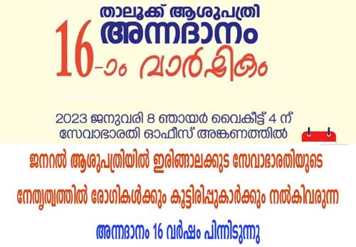 സേവാഭാരതിയുടെ നേതൃത്വത്തിൽ ഇരിങ്ങാലക്കുട ജനറൽ ആശുപത്രിയിൽ രോഗികൾക്കും കൂട്ടിരിപ്പുകാർക്കും ദിവസേന വൈകിട്ട് അന്നദാനം നൽകിക്കൊണ്ട് ആരംഭിച്ച സേവാ പ്രവർത്തനം 16 വർഷം പിന്നിടുന്നു. ഇതോടനുബന്ധിച്ച് ജനുവരി 8 ഞായറാഴ്ച സേവാഭാരതി ഓഫീസിൽ 16-ാം വാർഷികാഘോഷങ്ങൾ നടന്നു.