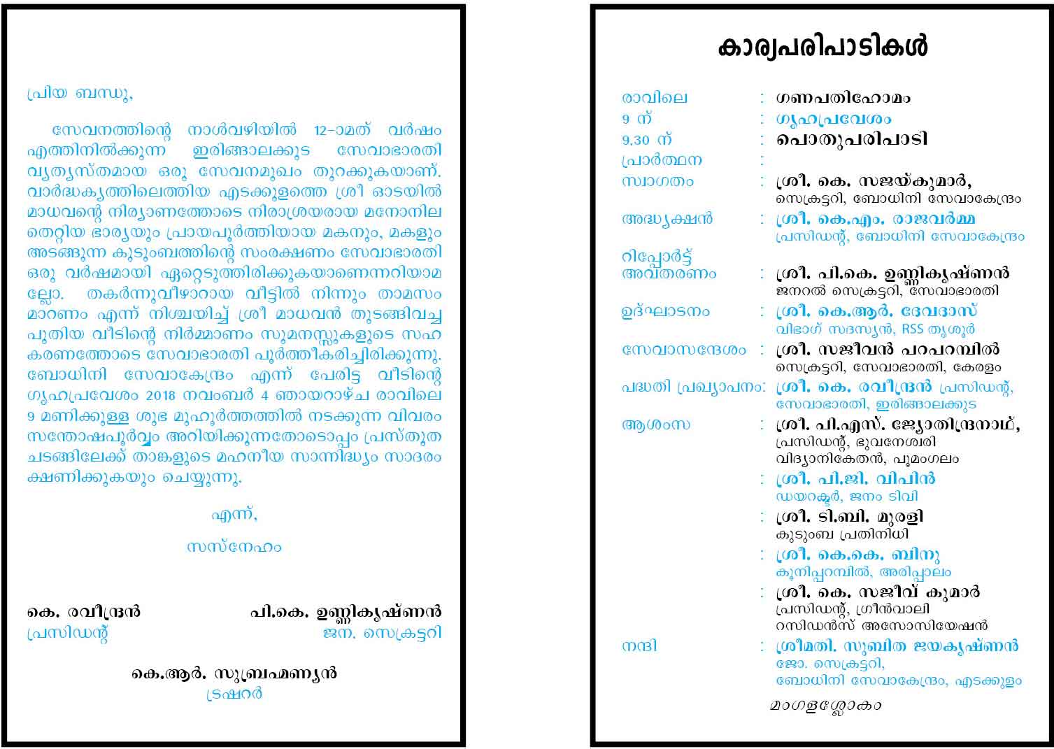കുടുംബനാഥന്റെ അകാല നിര്യാണത്താൽ നിരാശ്രയരായ ഭാര്യക്കും മക്കൾക്കും അദ്ദേഹം തുടങ്ങിവച്ച വീടിന്റെ നിർമ്മാണം ഇരിങ്ങാലക്കുട സേവാഭാരതി സുമനസ്സുകളുടെ സഹകരണത്തോടെ പൂർത്തീകരിച്ച് ‘ബോധിനി സേവാകേന്ദ്രം’ എന്ന് പേരിട്ട വീടിന്റെ ഗൃഹപ്രവേശന ചടങ്ങ് ആർ എസ് എസ് വിഭാഗ് സദസ്യൻ കെ ആർ . ദേവദാസ് ഉദ്ഘാടനം നിർവഹിച്ചു.