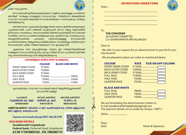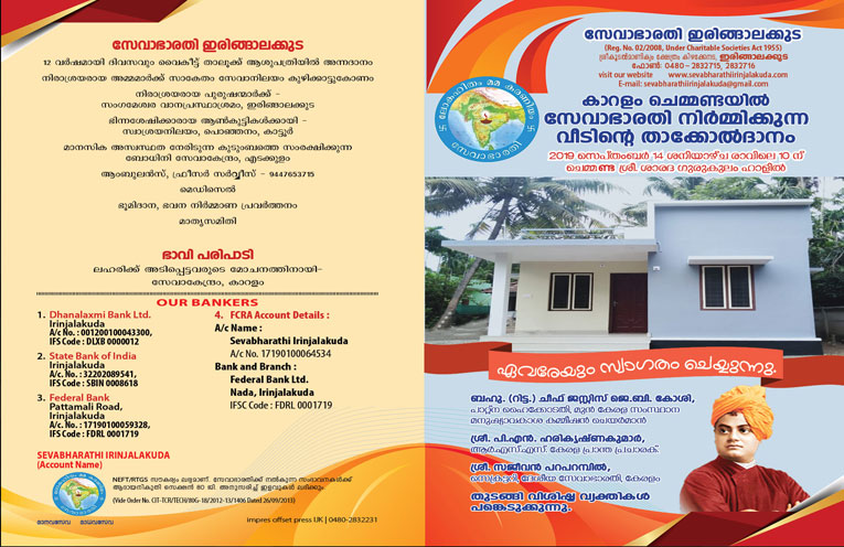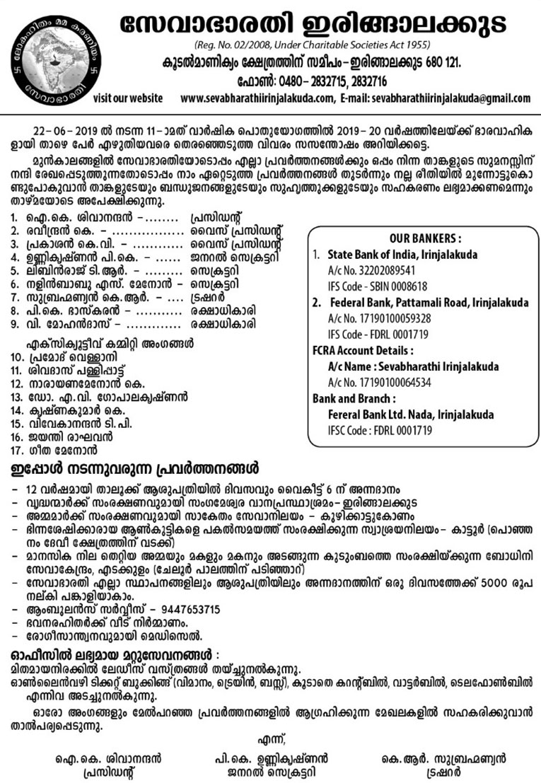 A/C Name : Sevabharathi Irinjalakuda A/C. NO. 17190100059328 Federal Bank Ltd., NADA, IRINJALAKUDA – 680121. IFSC code:FDRL0001719