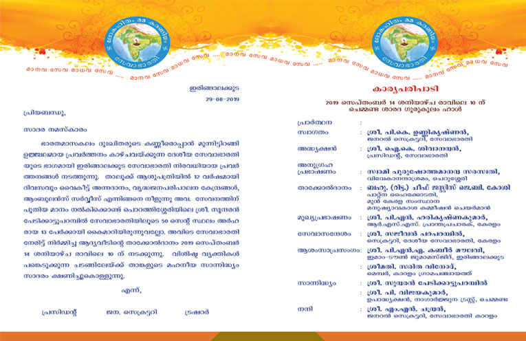 ഇരിഞ്ഞാലക്കുട സേവാഭാരതി പ്രസിഡന്റ് ശ്രീ നളിൻ മേനോൻ അധ്യക്ഷത വഹിച്ചു. സെക്രട്ടറി ശ്രീ P K ഉണ്ണികൃഷ്ണൻ സ്വാഗതം ആശംസിച്ചു. രാഷ്ട്രീയ സ്വയം സേവക സംഘം പ്രാന്ത സഹ സേവ പ്രമുഖ ശ്രീ U N ഹരിദാസ് സൂവനീർ പ്രകാശനം നിർവഹിക്കുകയും സേവാ സന്ദേശം നൽകുകയും ചെയ്തു.ചെറുശ്ശേരി വിവേകാനന്ദ ആശ്രമത്തിലെ സ്വാമി പുരുഷോത്തമാനന്ദ സരസ്വതി, വാർഡ് മെമ്പർ സ്മിത കൃഷ്ണകുമാർ, രാഷ്ട്രീയ സ്വയം സേവക സംഘം ജില്ലാ സംഘചാലക് ശ്രീ ബാലഗോപാൽ, സാമൂഹ്യ സുരക്ഷ വകുപ്പിലെ കൗൺസിലർ ശ്രീമതി ദിവ്യ, ആശ്രമം ട്രസ്റ്റീ കല്യാണി ഗോപിനാഥ് എന്നിവർ ആശംസയർപ്പിച്ചു സംസാരിച്ചു.സേവാഭാരതി ട്രഷറർ ശ്രീ K R സുബ്രഹ്മണ്യൻ നന്ദി രേഖപെടുത്തി.ഒട്ടനവധി പ്രമുഖ വ്യക്തിത്വങ്ങൾ ചടങ്ങിൽ പങ്കെടുത്തു.