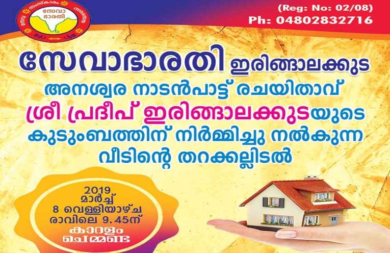 നാടൻപാട്ട് രചയിതാവ് പ്രദീപ് ഇരിങ്ങാലക്കുടയുടെ കുടുംബത്തിന് സേവാഭാരതി നിർമ്മിക്കുന്ന വീടിന്റെ തറക്കലിടൽ മാർച്ച് 8 ന്