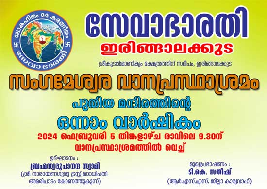 സേവാഭാരതി സംഗമേശ്വര വാനപ്രസ്ഥാശ്രമം പുതിയ മന്ദിരത്തിൻ്റെ ഒന്നാം വാർഷികം 2024 ഫെബ്രുവരി 5 തിങ്കളാഴ്ച രാവിലെ 9.30ന് വാനപ്രസ്ഥാശ്രമത്തിൽ വെച്ച്